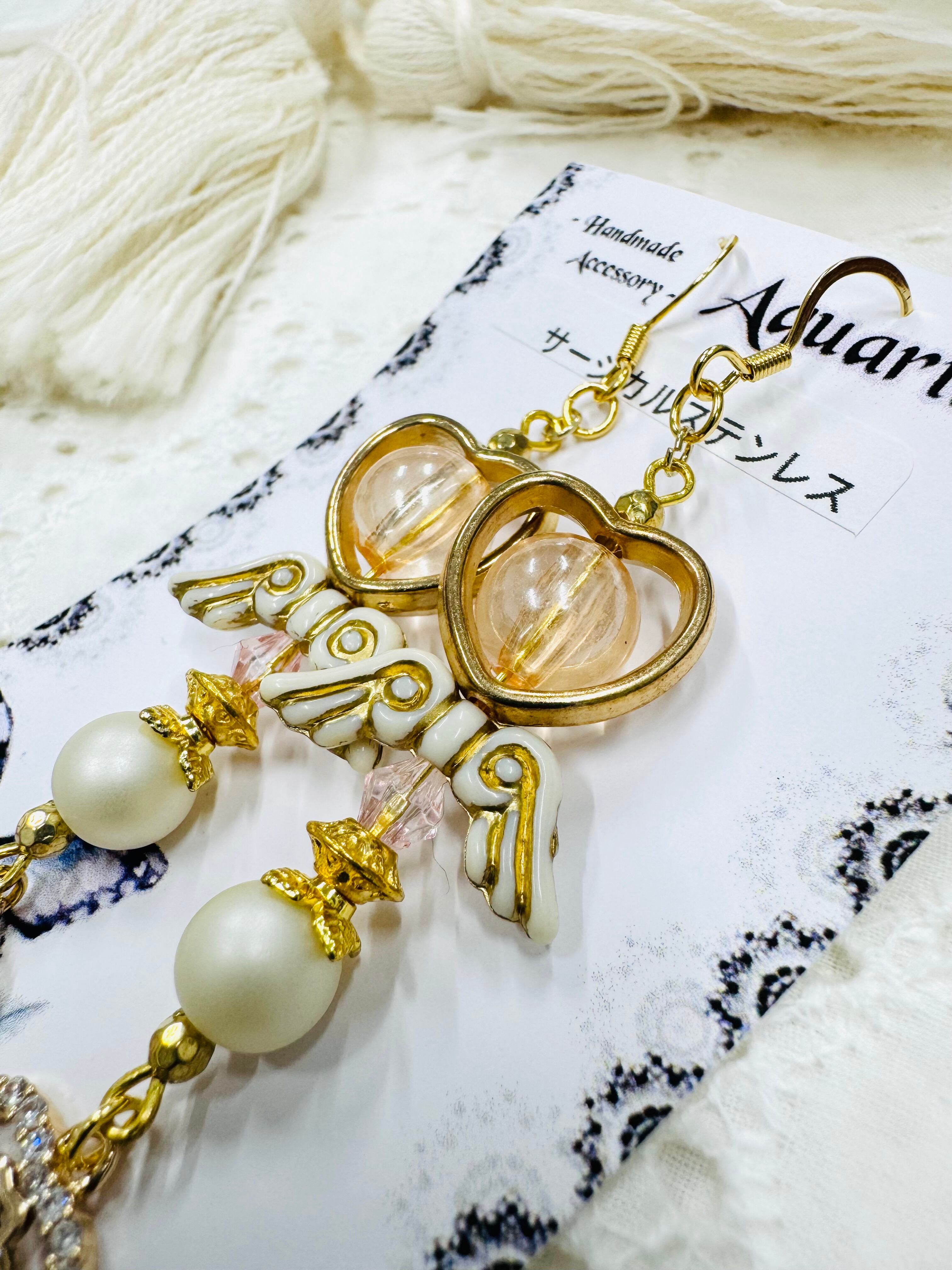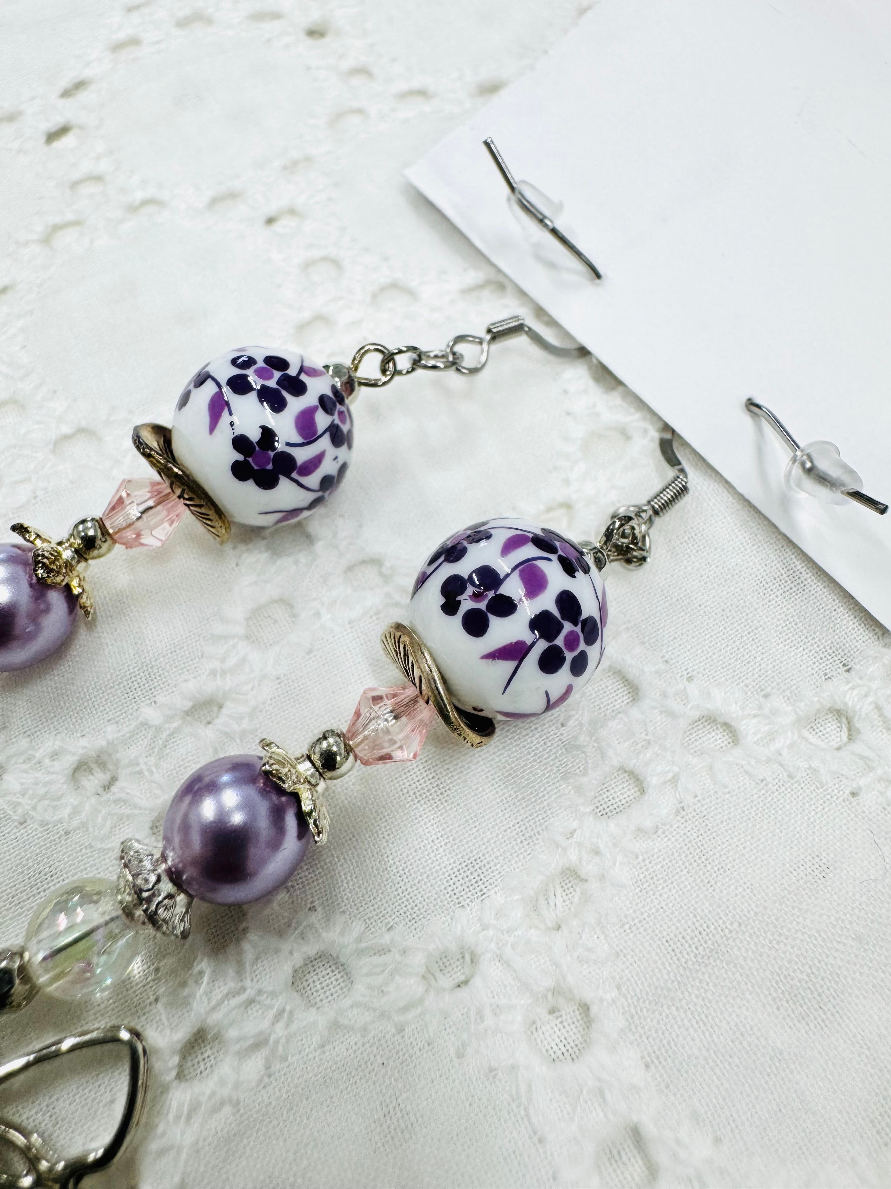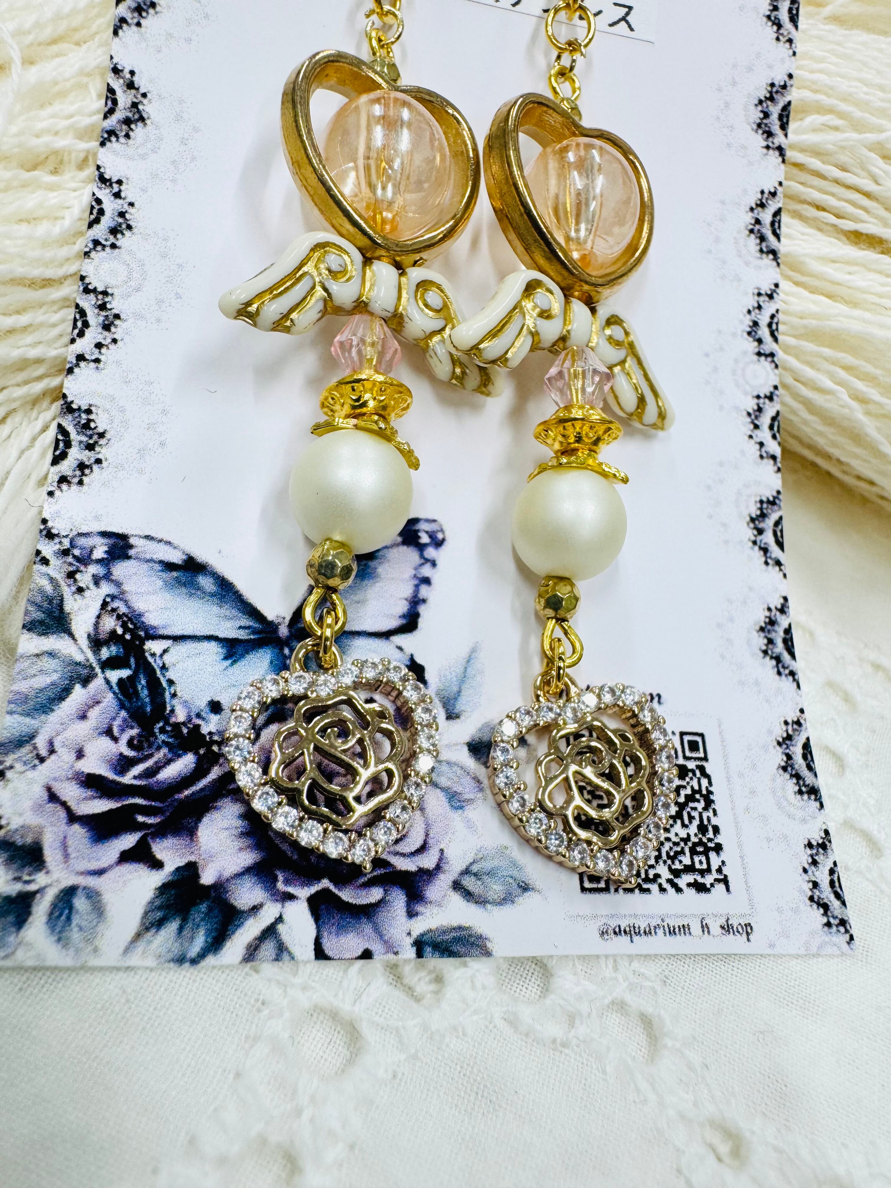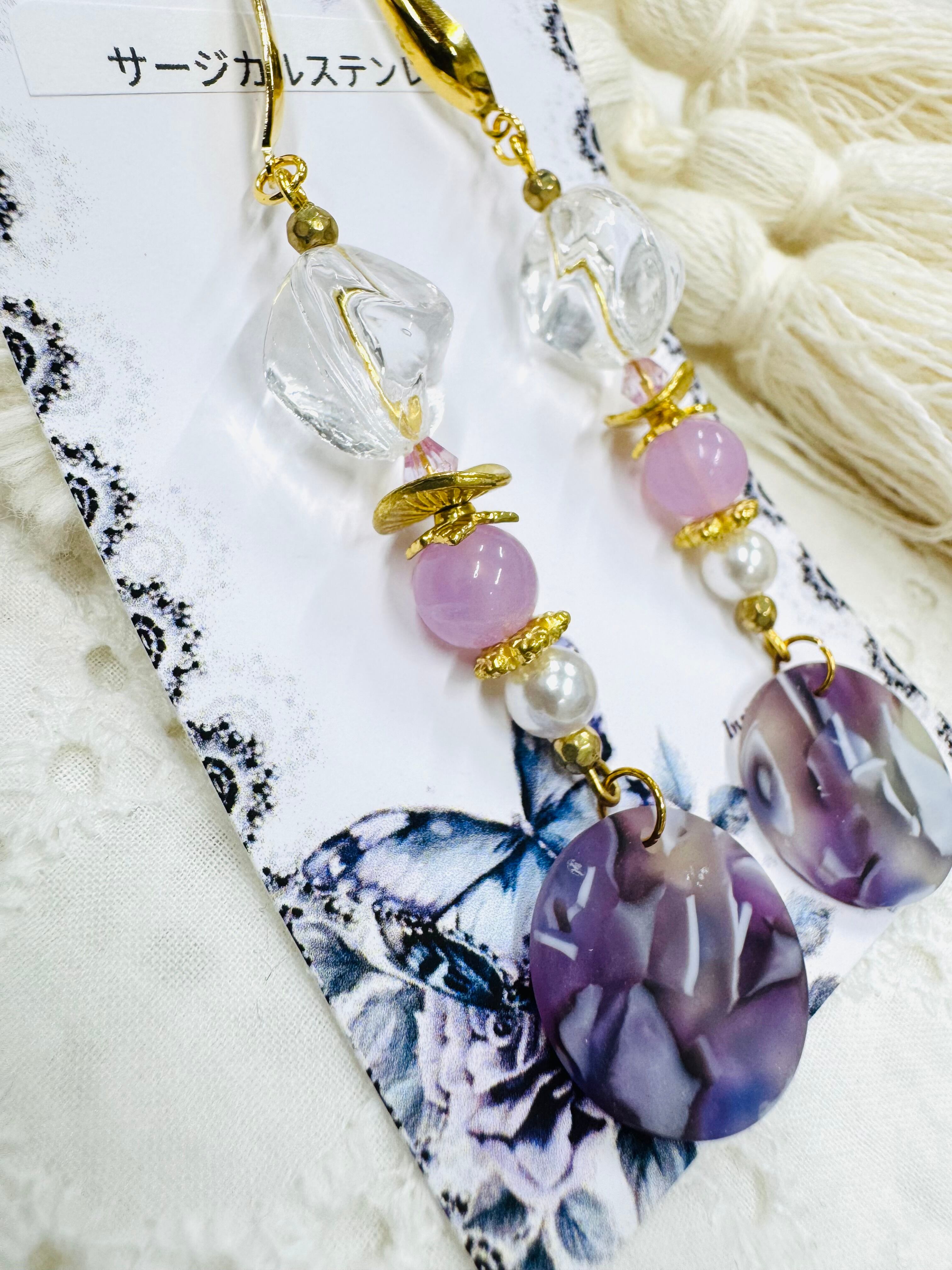 しゃらしゃら大人可愛いデザインの一点物アクセサリー。個性的なビーズやモチーフを組み合わせ、耳元を華やかに彩ります。