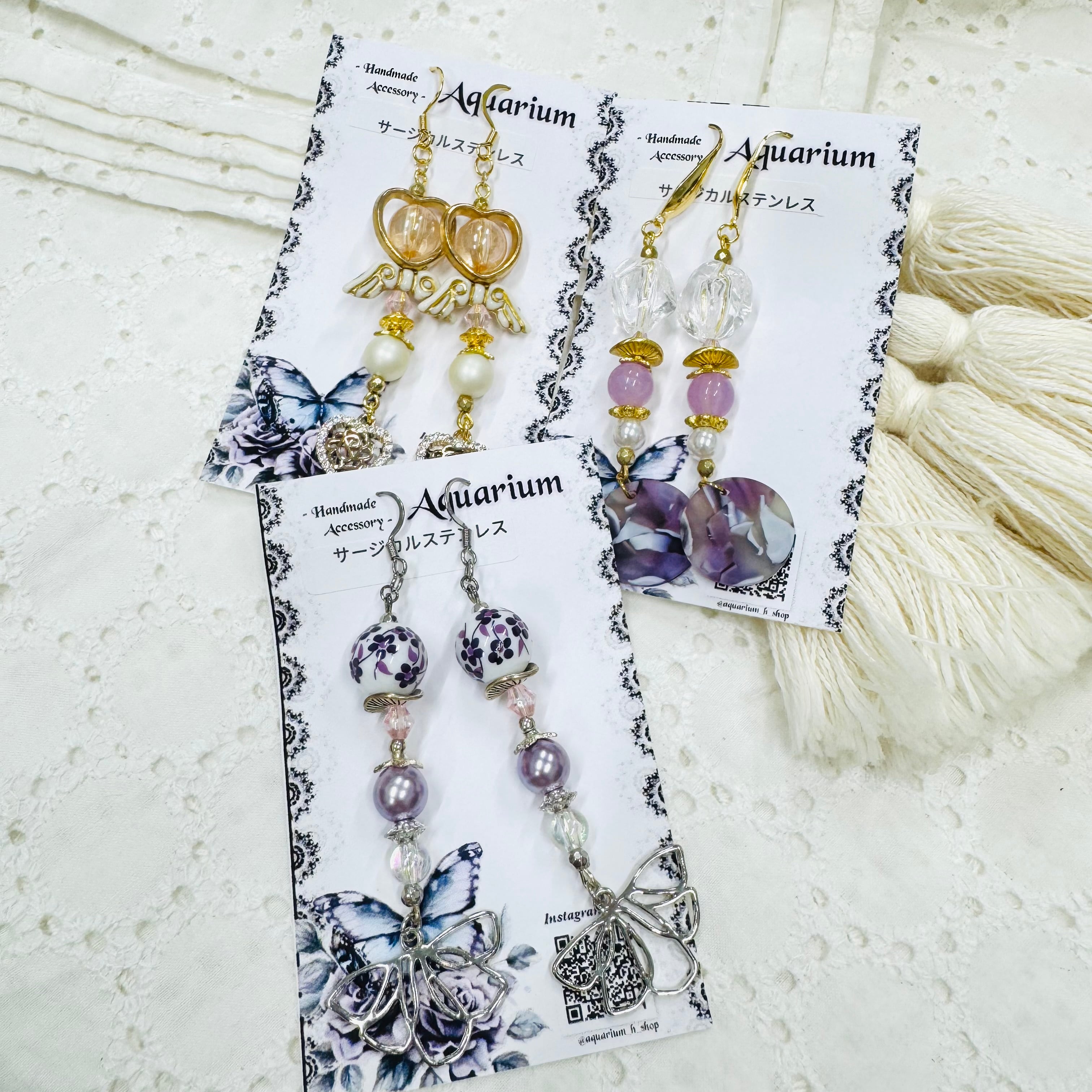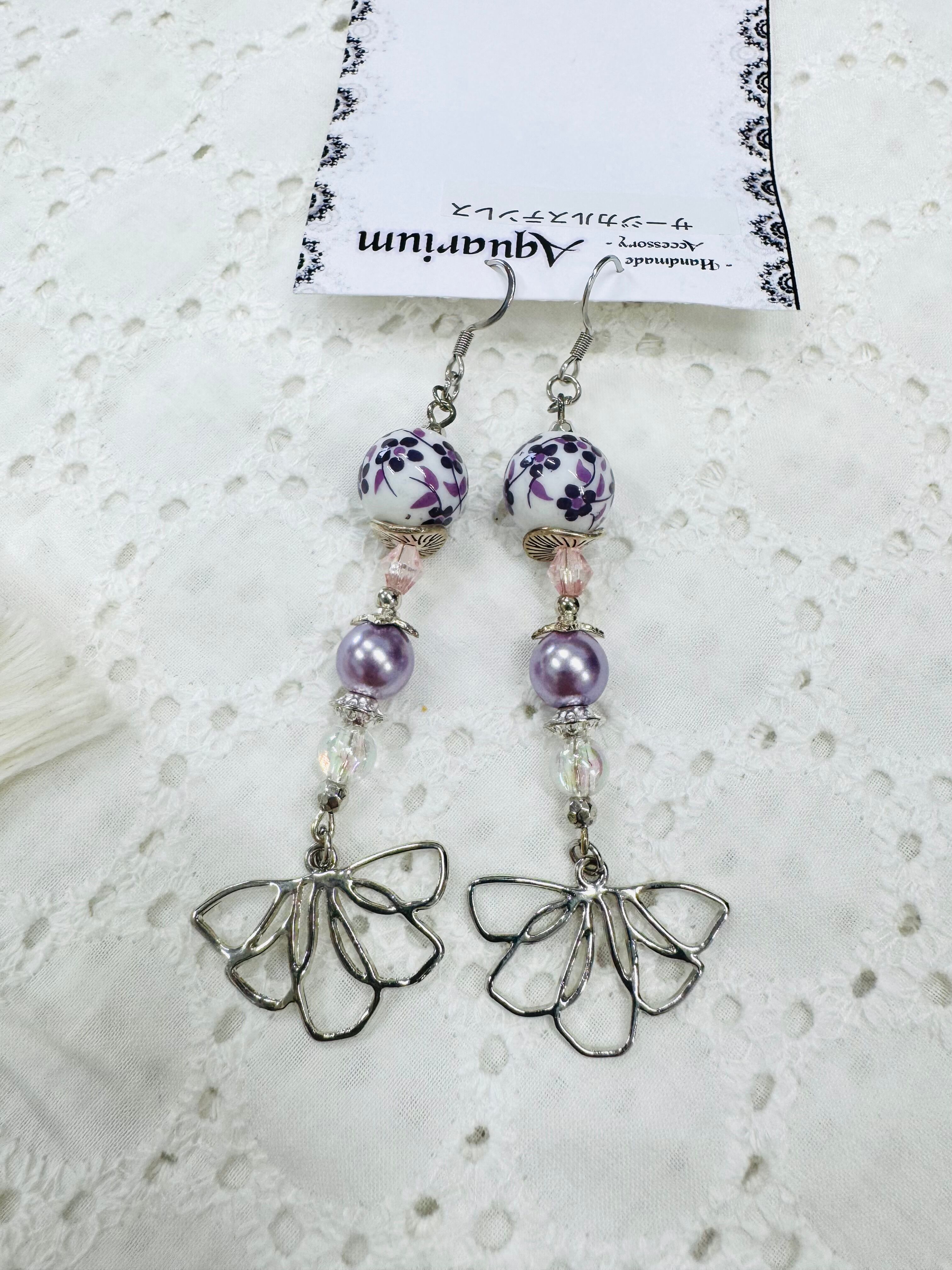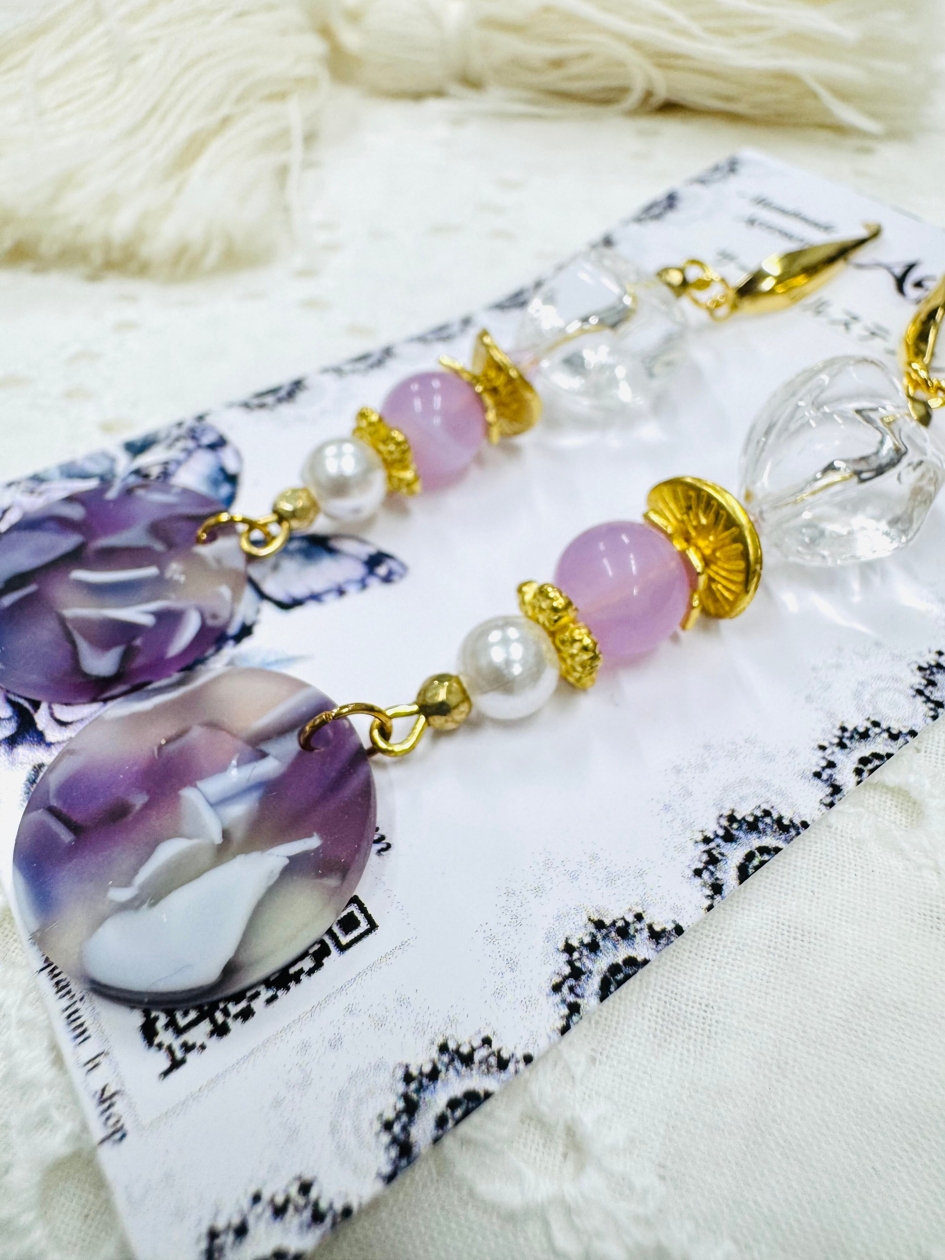 しゃらしゃら大人可愛いデザインの一点物アクセサリー。個性的なビーズやモチーフを組み合わせ、耳元を華やかに彩ります。