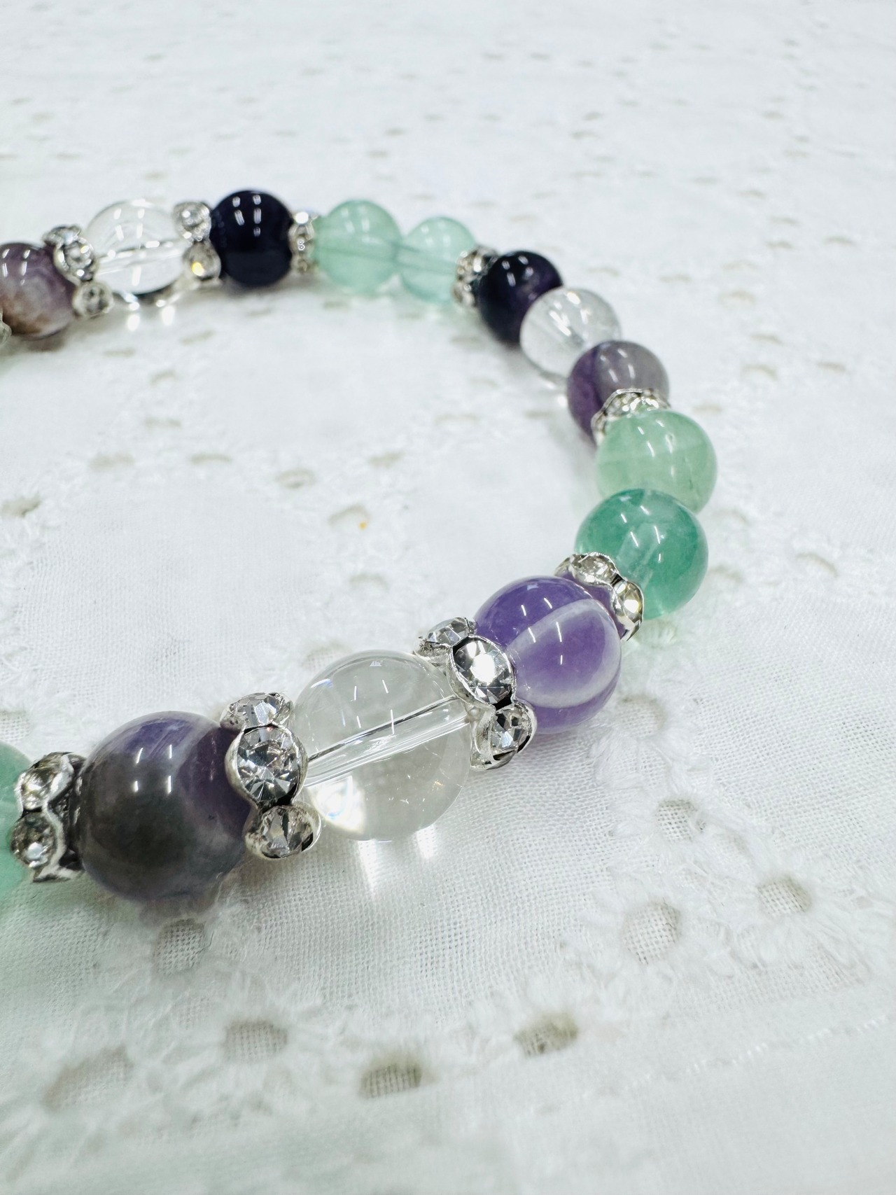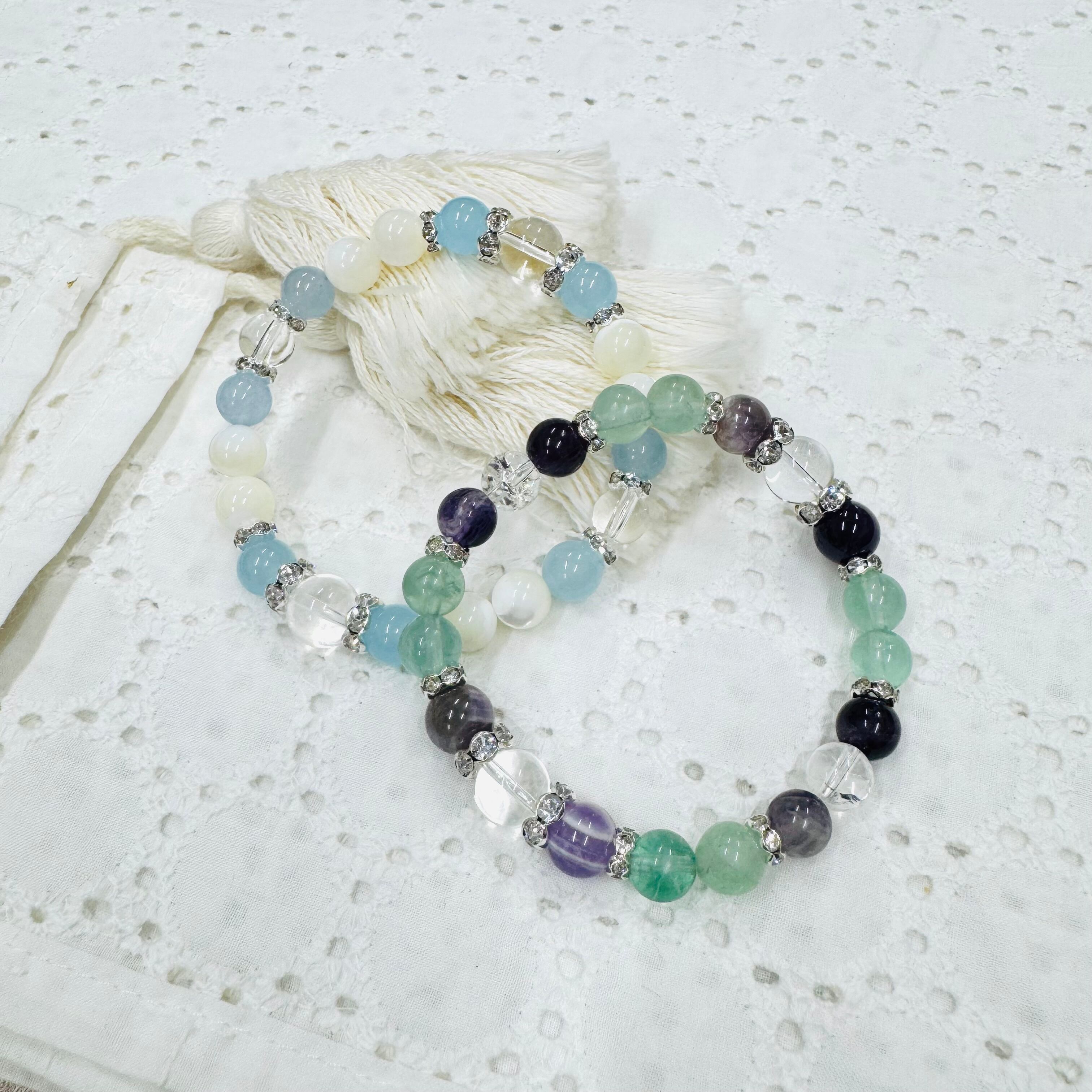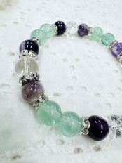 紫と白が織りなす幻想的な模様が美しいケープアメジストとグリーンとパープルのグラデーションが魅力のフローライトを組み合わせたブレスレット