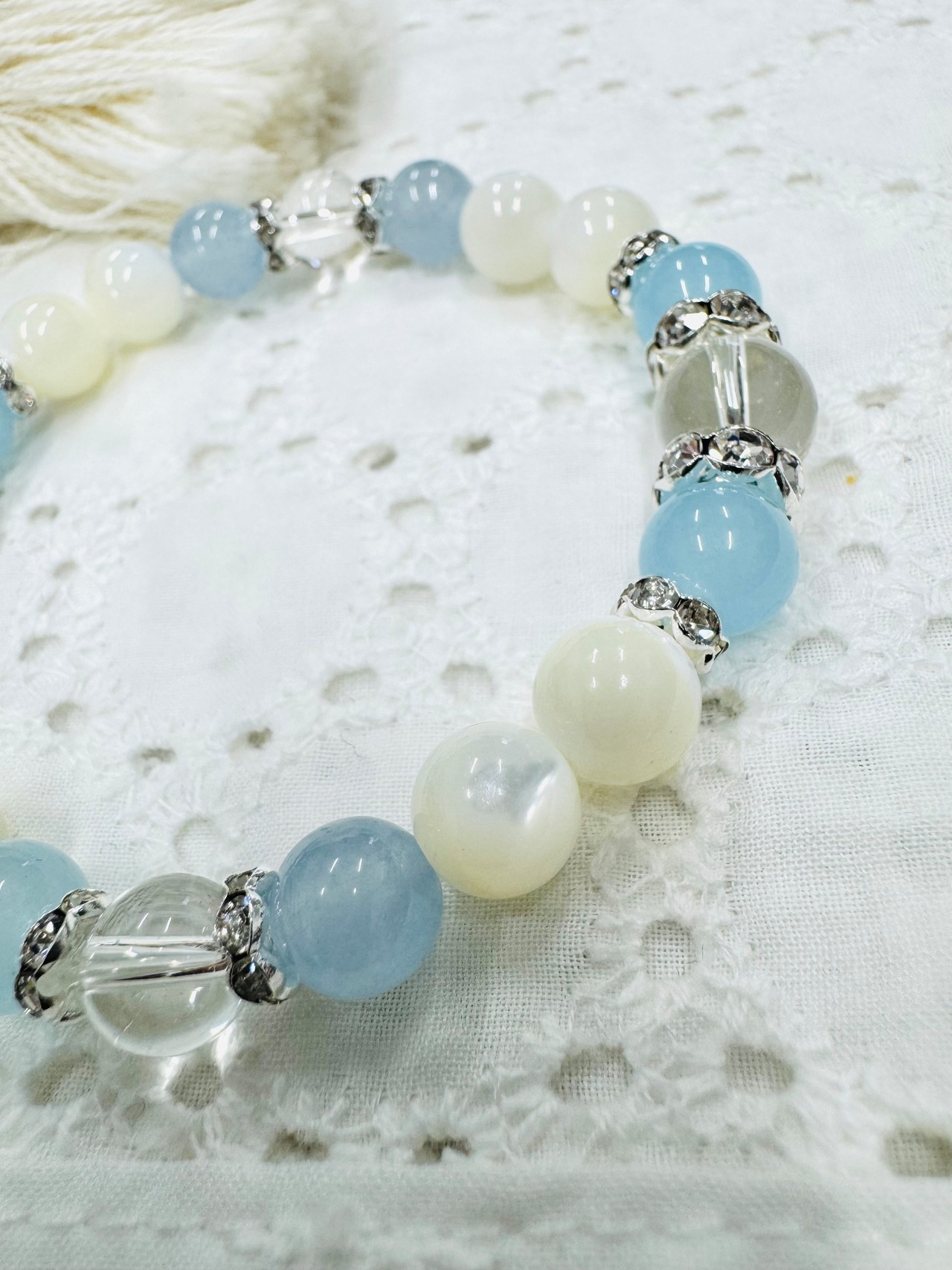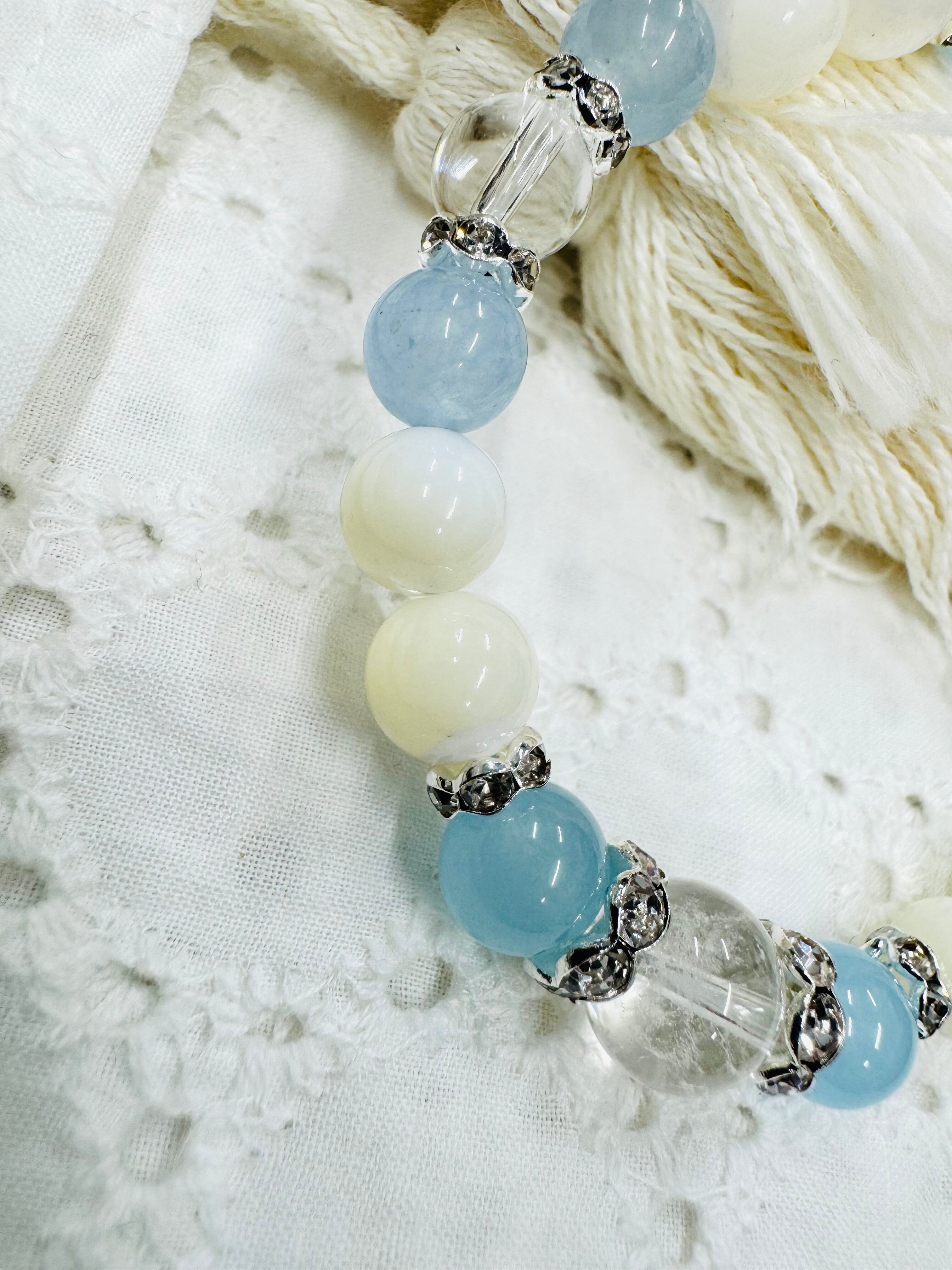 透き通るようなブルーのアクアマリンと上品な光沢を持つマザーオブパールを組み合わせたアクセサリー