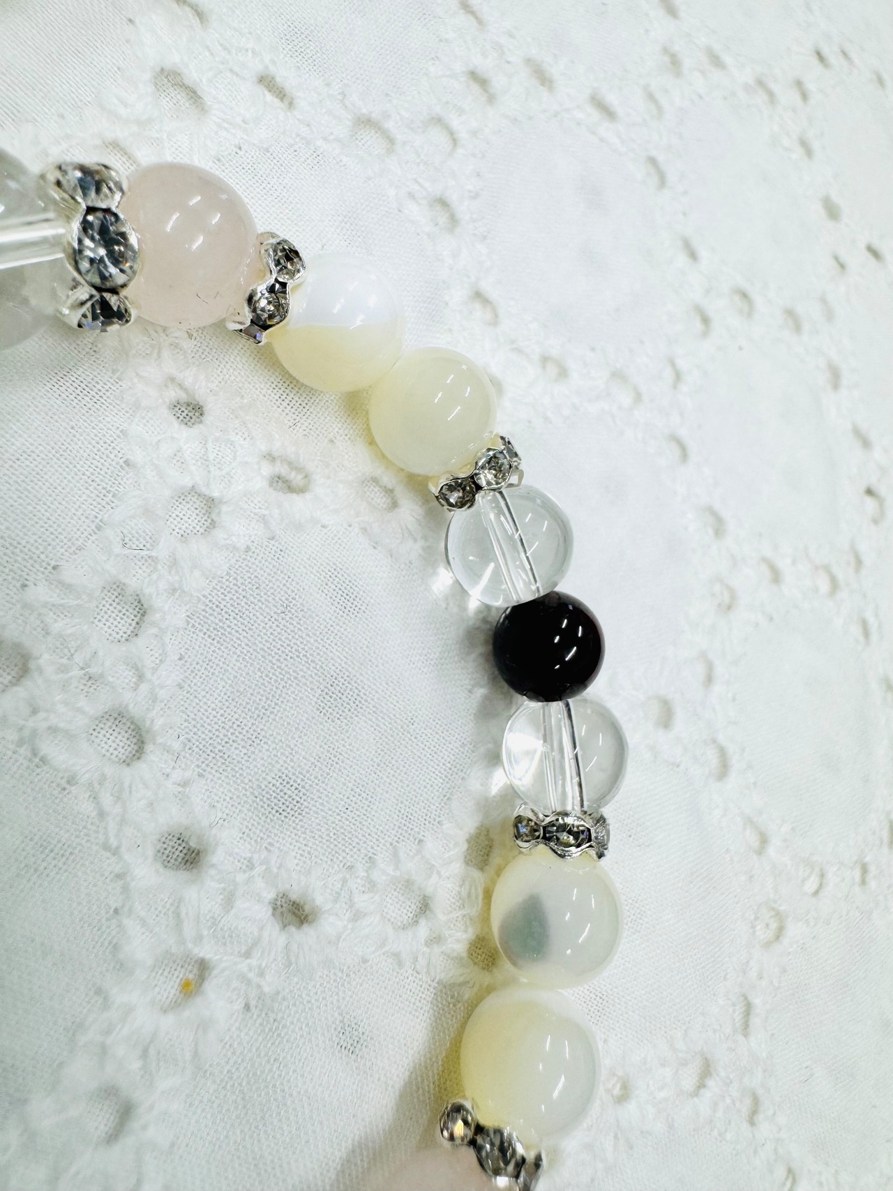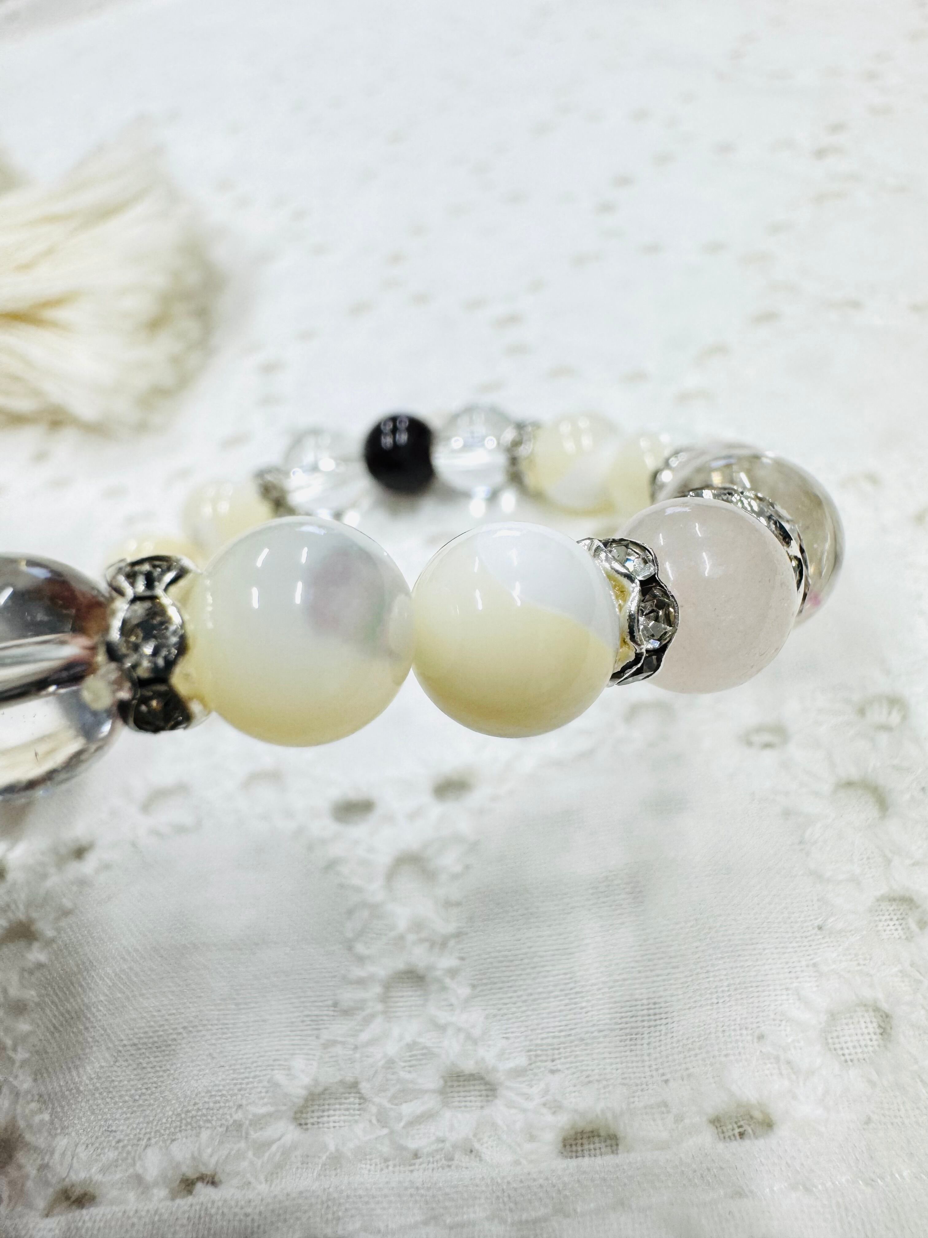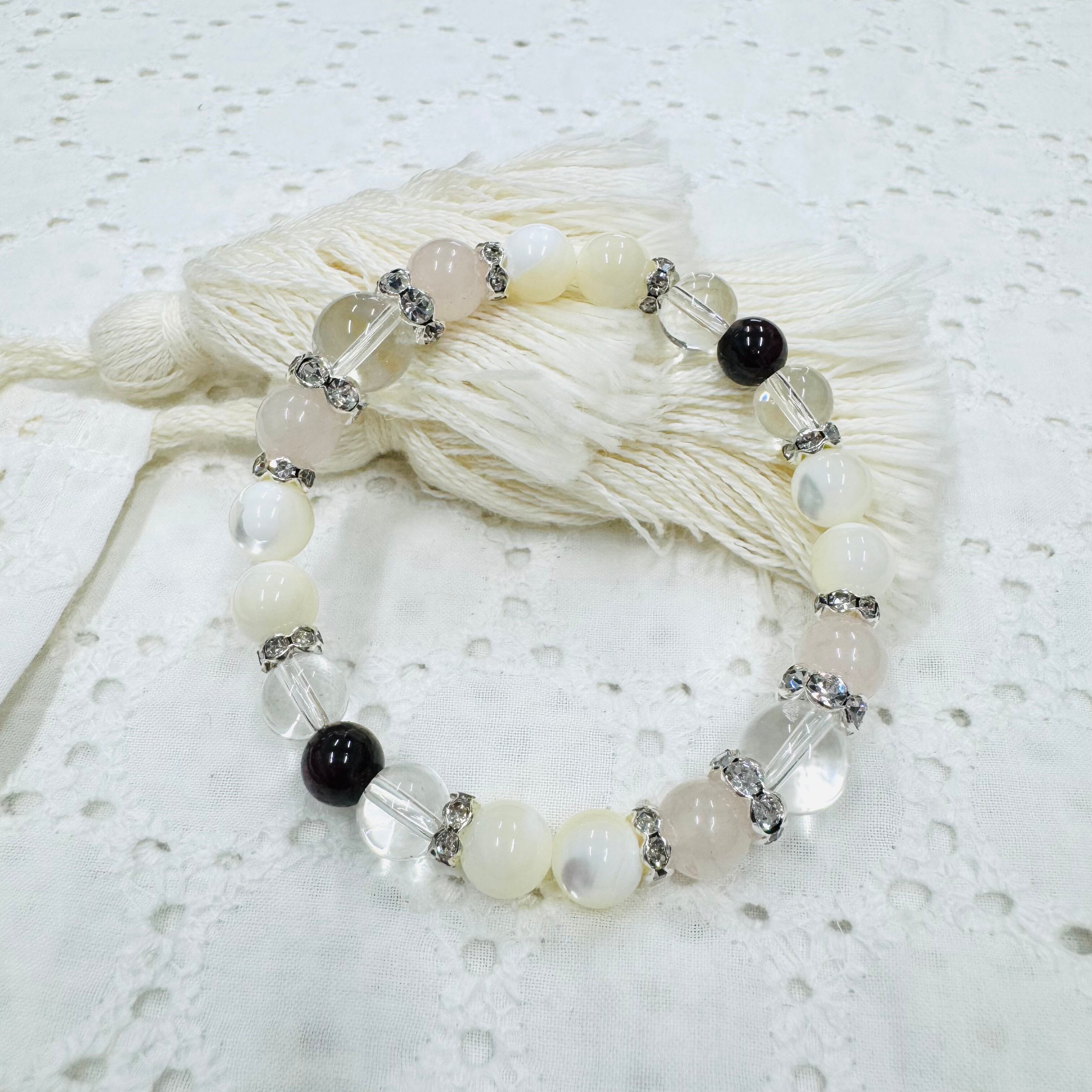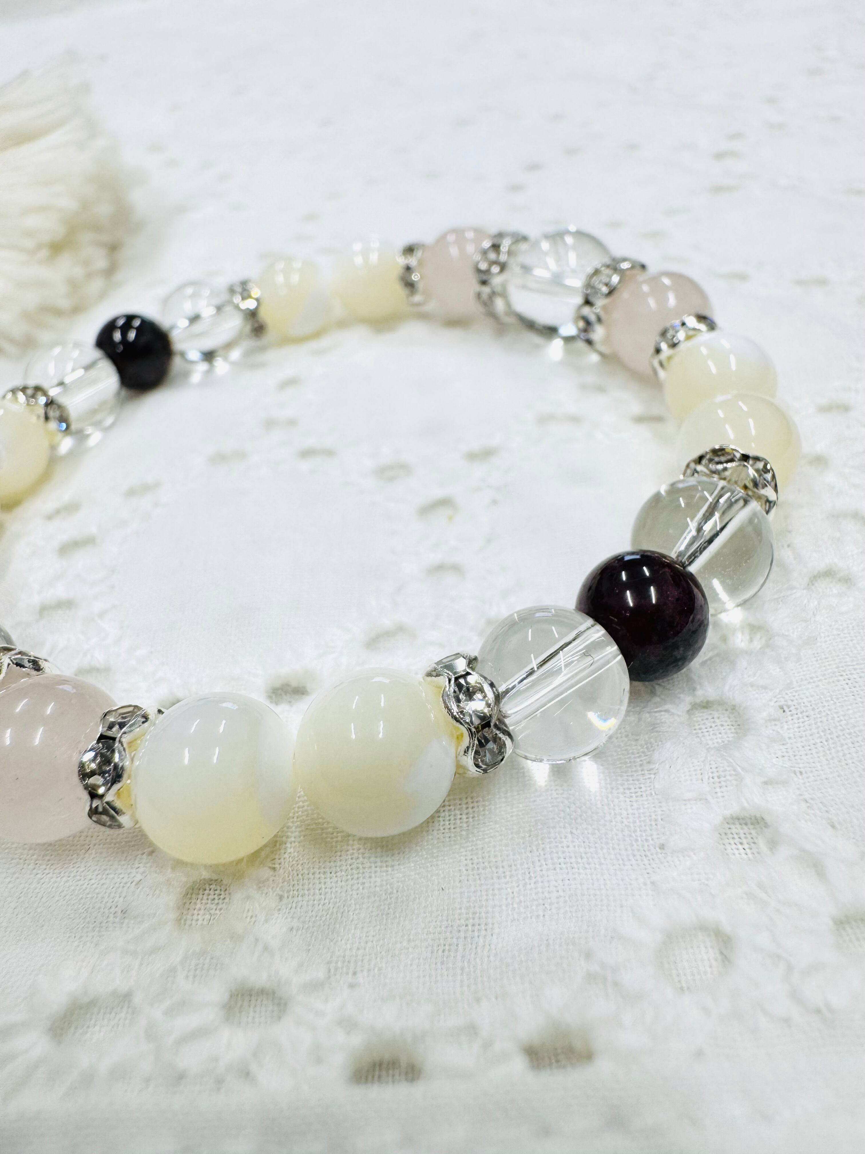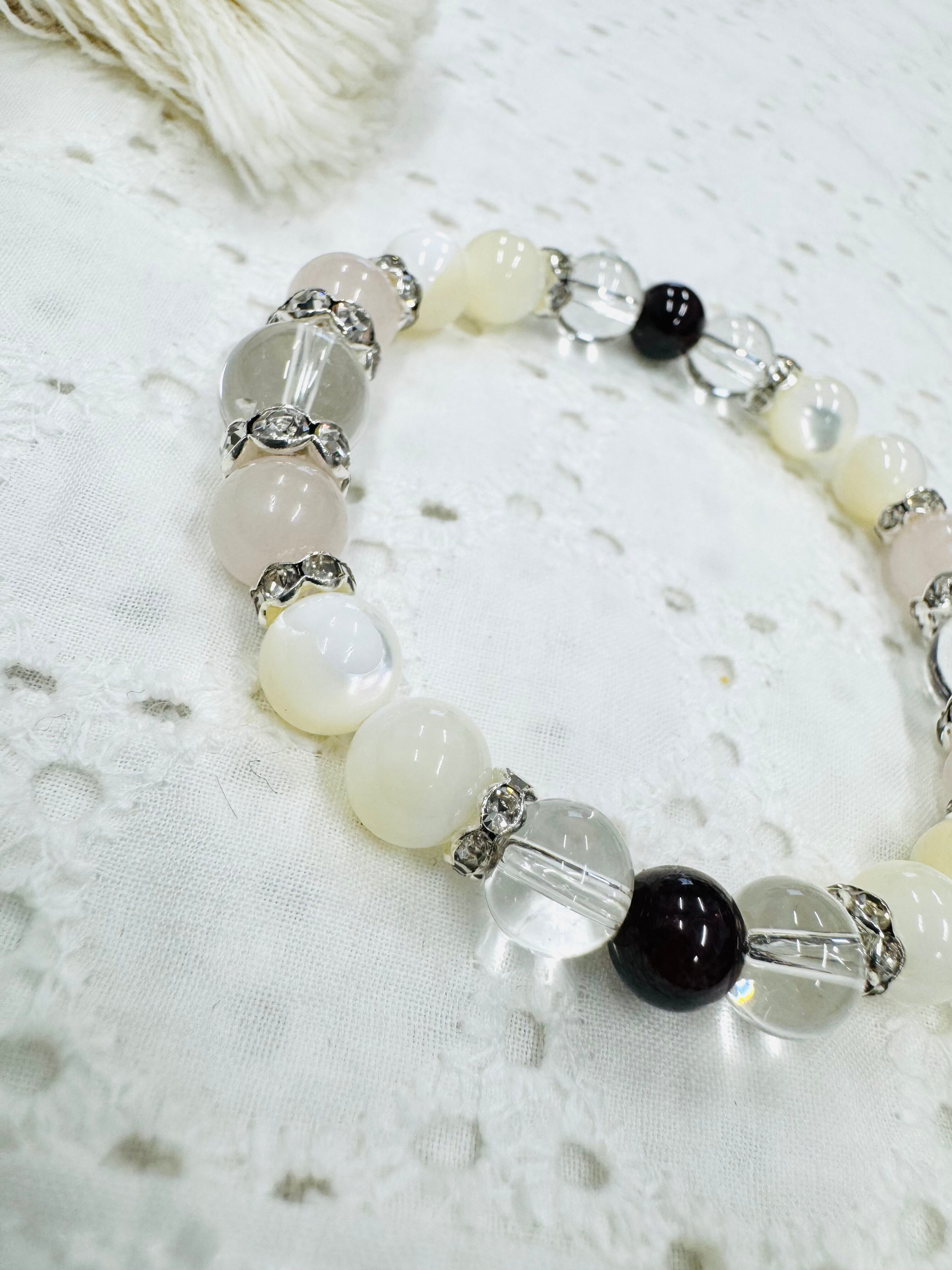 個性的なグラデーションのマザーオブパールと淡く輝くローズクォーツを組み合わせたブレスレットです